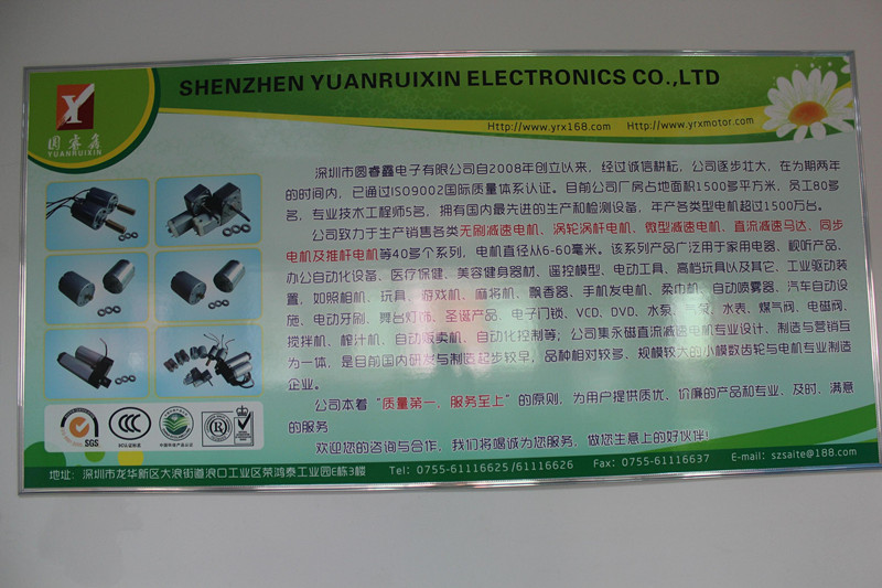 深圳市圓睿鑫電子有限公司自2008年創立以來,經過誠信耕耘,在為期兩年的時間內,已通過ISO9001:2000國際質量體系認證。公司廠房占地面積2000多平方米,員工100人,專業技術工程師6名,擁有國內最先進的生產和檢測設備,年產各類減速電機超過2~300萬臺。因公司發(fā)展需要,于2020年底,將生產基地遷往擁有最美小鎮之稱的東莞市清溪鎮,依山傍水,依托美麗的大自然環(huán)境和地方文化,全新的東莞市圓睿鑫電子有限公司將借助深圳母公司平臺,一步步走上新的臺階。